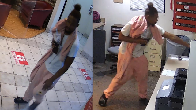 and then fled the lobby to an awaiting white four-door sedan. The suspects